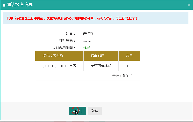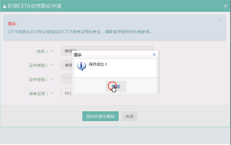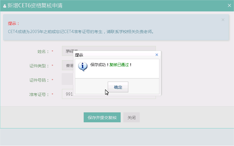 填写考生的四级准考证号,如果准考证号正确,那么姓名和证件号码任意一项正确就可以自动审核通过。
