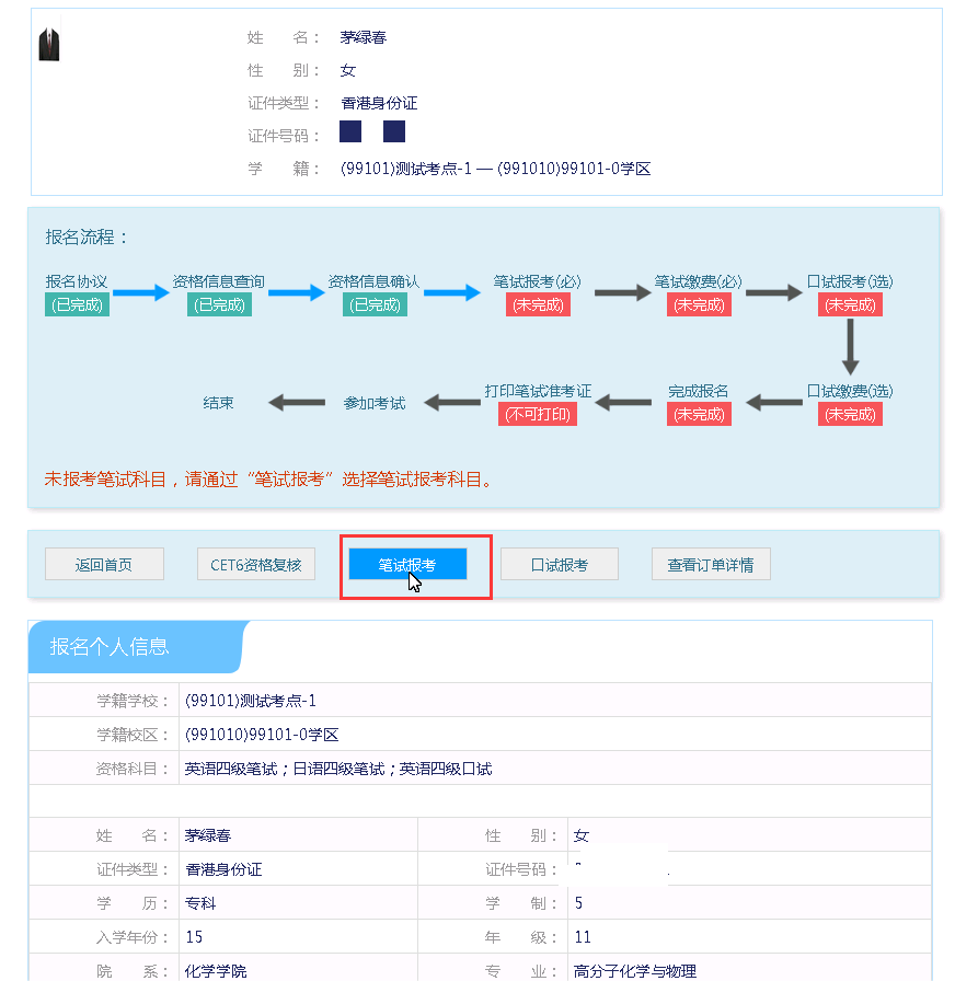 在考生报名信息页面,点击“笔试报考”按钮,进入笔试报考页面