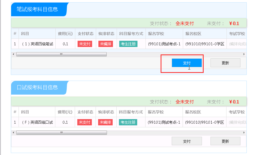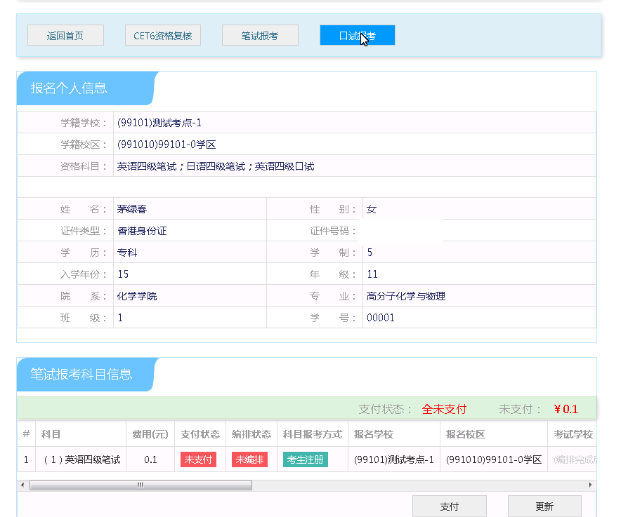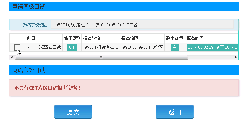 选择要报考的科目,点击“提交”按钮,返回到考生报名页面,点击“口试报考”