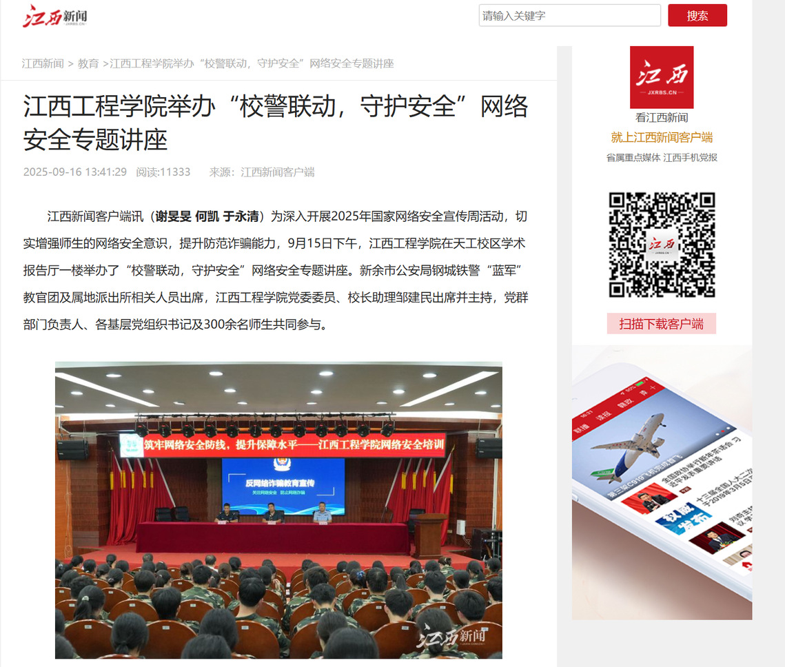 江西新闻客户端讯(谢旻旻 何凯 于永清)为深入开展2025年国家网络安全宣传周活动,切实增强师生的网络安全意识,提升防范诈骗能力,9月15日下午,beat365体育官方网站在天工校区学术报告厅一楼举办了“校警联动,守护安全”网络安全专题讲座。新余市公安局钢城铁警“蓝军”教官团及属地派出所相关人员出席,beat365体育官方网站党委委员、校长助理邹建民出席并主持,党群部门负责人、各基层党组织书记及300余名师生共同参与。