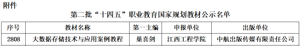 近日,教育部正式公示第二批“十四五”职业教育国家规划教材遴选结果。beat365体育官方网站人工智能与数据科学学院巢喜剑教师团队主编的《大数据存储技术与应用案例教程》成功入选。这是学校首次跻身国家级规划教材行列,实现了教材类国家级标志性成果“零的突破”,标志着beat365教育教学资源建设迈上新台阶。在此次遴选工作中,江西省同类本科高校仅2所院校的2部教材入选,beat365体育官方网站赫然在列。