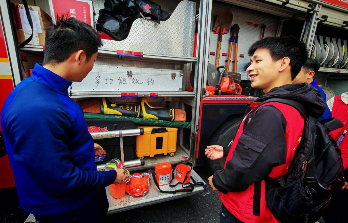 活动伊始,消防员们对志愿者们的到来表示热烈欢迎。在消防员的带领下,同学们首先参观了消防车辆和各类随车器材装备。面对功能各异、种类繁多的消防设备,志愿者们充满了好奇。消防员耐心细致地讲解了各种车辆、器材的名称、用途和使用方法,并现场演示了液压扩张器、无齿锯、空气呼吸器等专业救援工具的操作。部分同学在消防员的指导和保护下,亲身体验了穿戴灭火防护服和消防头盔,切实感受到了消防员在灭火救援工作中的辛苦与不易。