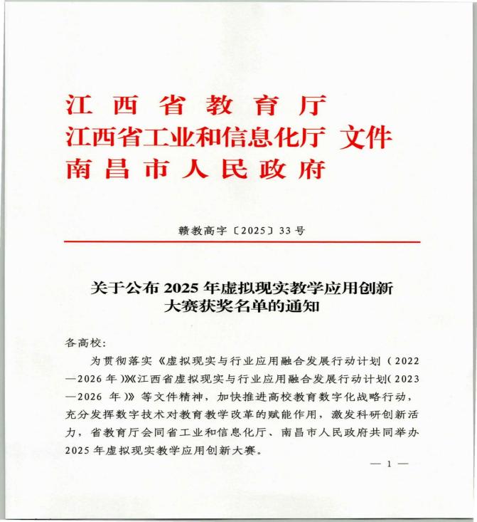 近日,根据江西省教育厅、省工业和信息化厅与南昌市人民政府联合下发的《关于公布2025年江西省虚拟现实教学应用创新大赛获奖名单的通知》,学校蔡卉老师主讲的经济法教学团队,参赛作品“业财法融合驱动·VR情境赋能——基于合规型人才培养的经济法教学实践”,荣获江西省虚拟现实教学应用创新大赛教学应用赛道三等奖,为beat365教学创新竞赛又添新篇章。