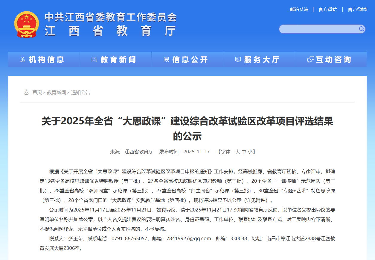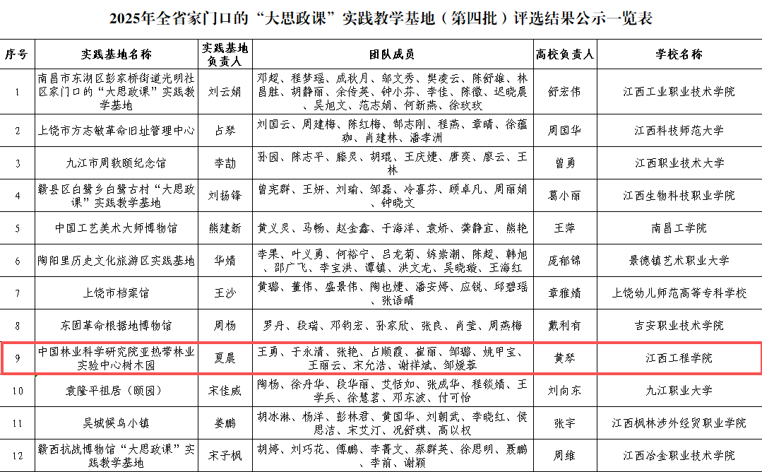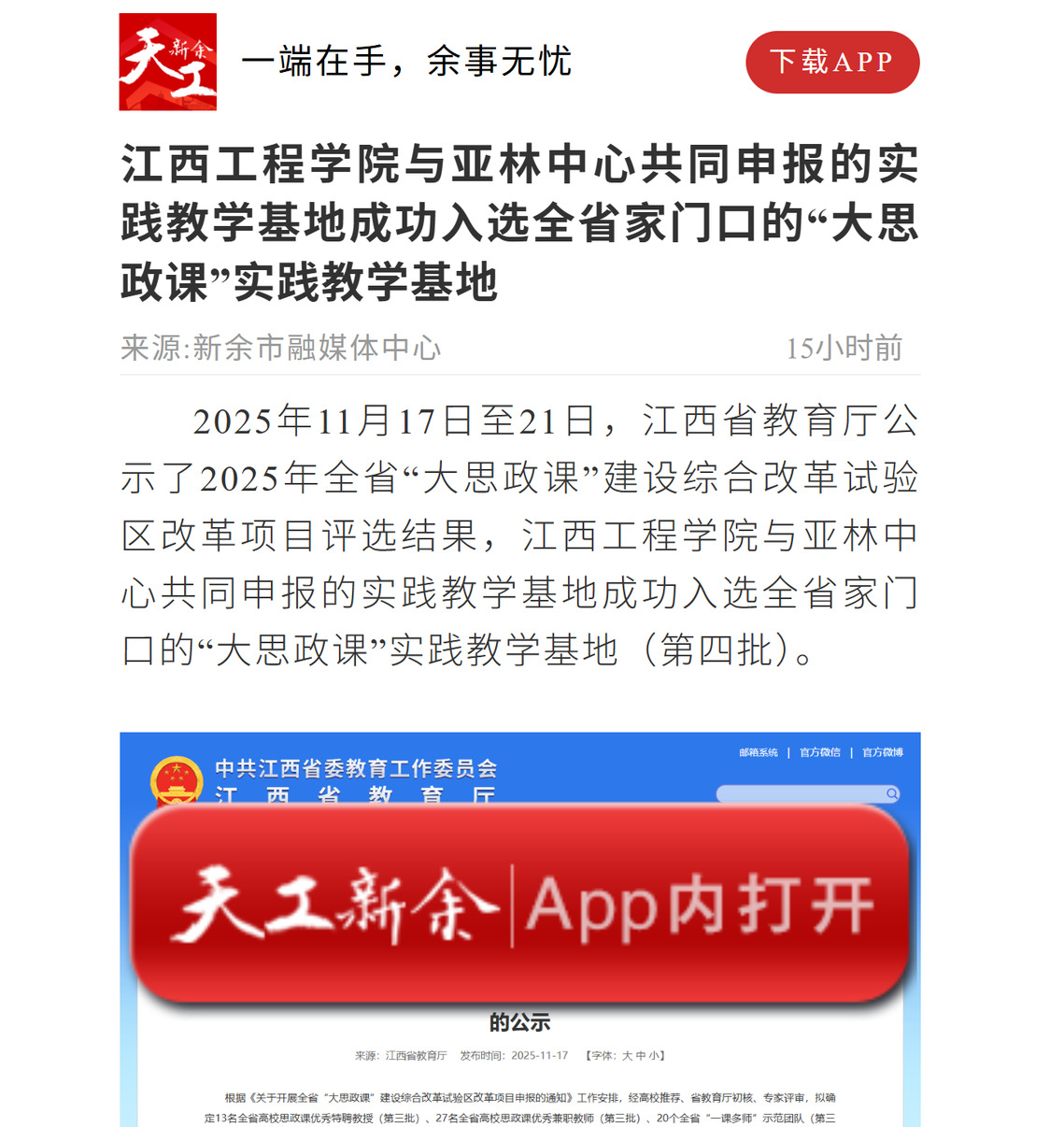2025年11月17日至21日,江西省教育厅公示了2025年全省“大思政课”建设综合改革试验区改革项目评选结果,beat365体育官方网站与亚林中心共同申报的实践教学基地成功入选全省家门口的“大思政课”实践教学基地(第四批)。