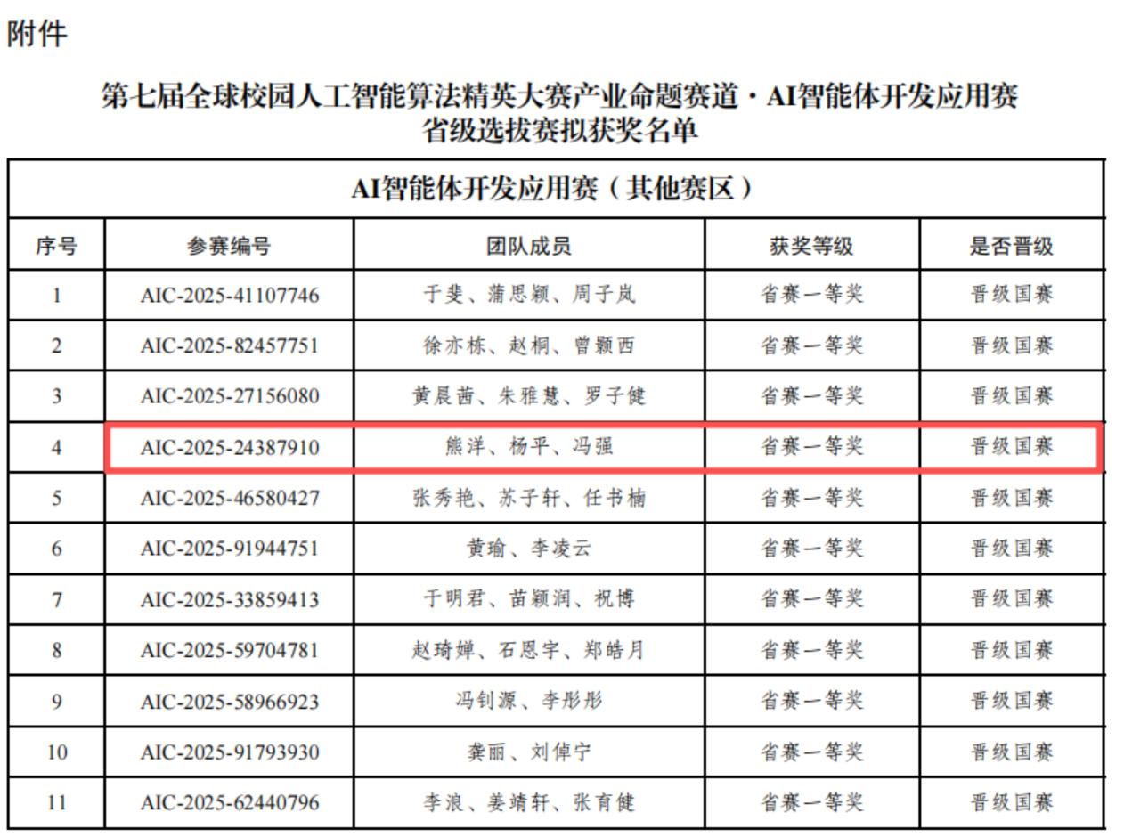 近日,2025年第七届全球校园人工智能算法精英大赛产业命题赛道·AI智能体开发应用赛省级选拔赛获奖名单正式公布。由beat365体育官方网站科技处积极组织,在人工智能与数据科学学院郜永生老师的悉心指导下,参赛学生熊洋、杨平、冯强团队荣获省赛一等奖,并晋级国赛。