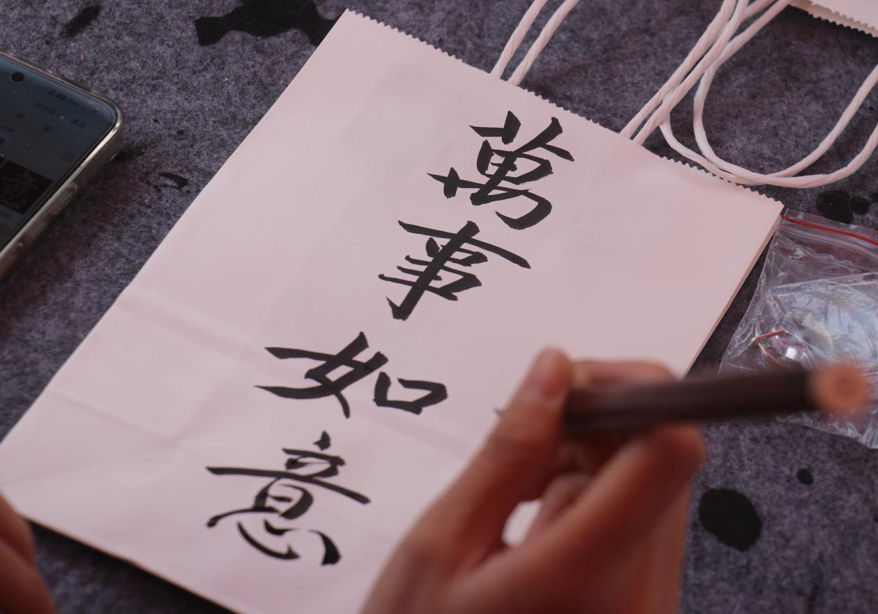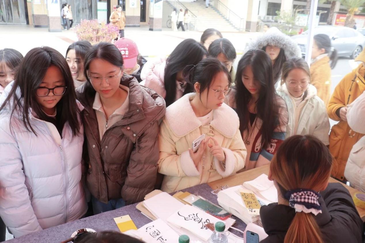 当日的温暖,由无数个被笔墨定格的瞬间构成:在经典临摹区,一位同学俯身案前,屏息静气,笔尖在名帖上从容游走;自由创作区,一位同学饱蘸浓墨,郑重写下“万事如意”四个大字,圆润饱满的笔触中满载着对新年的朴素祝福。而现场的猜谜互动区则不时爆发出欢笑与掌声,同学们围绕书法相关的谜题争相竞猜,在思辨与趣味中,进一步加深了对笔墨文化的感知。这些动静相宜的瞬间,共同汇成了冬日校园里最温暖的风景。