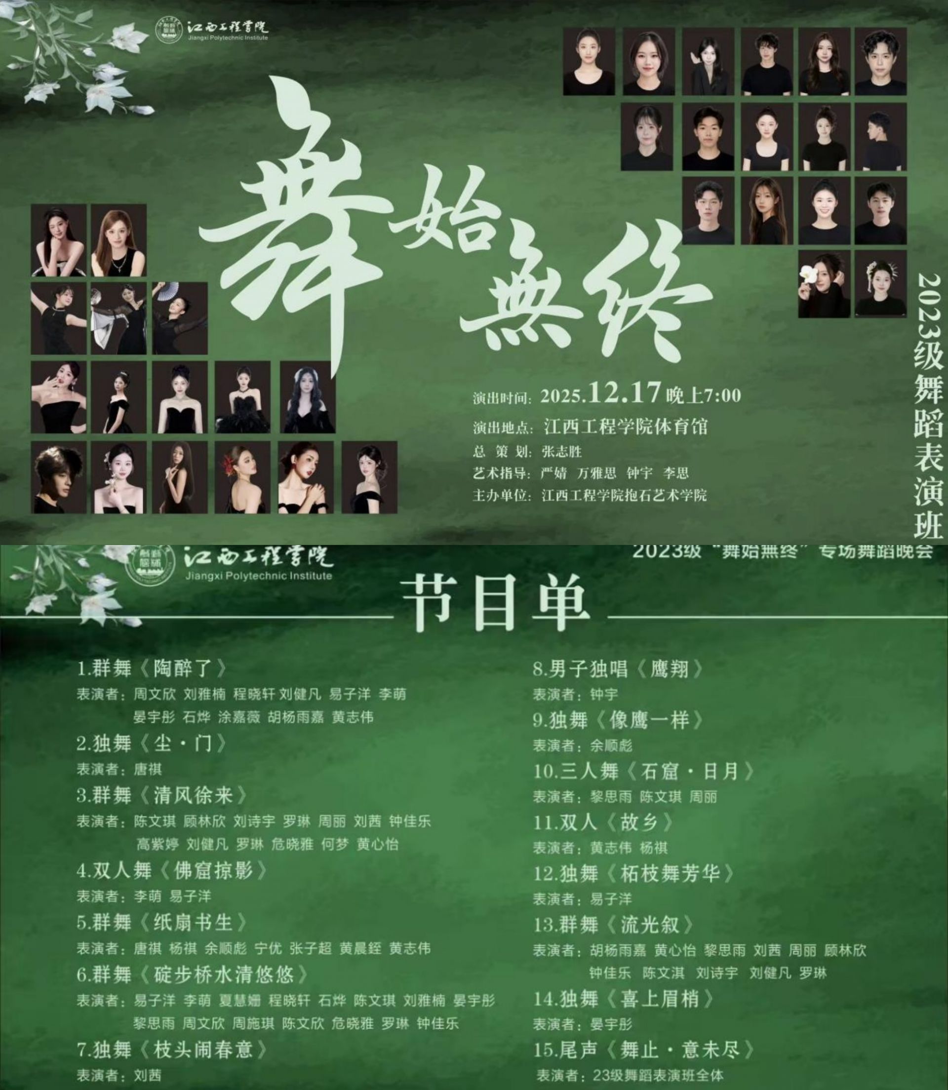 整场演出共呈现15个精彩节目,涵盖独舞、双人舞、三人舞、群舞及声乐表演,全面展示了学生们扎实的舞蹈功底、丰富的情感表达与多样的艺术风格。