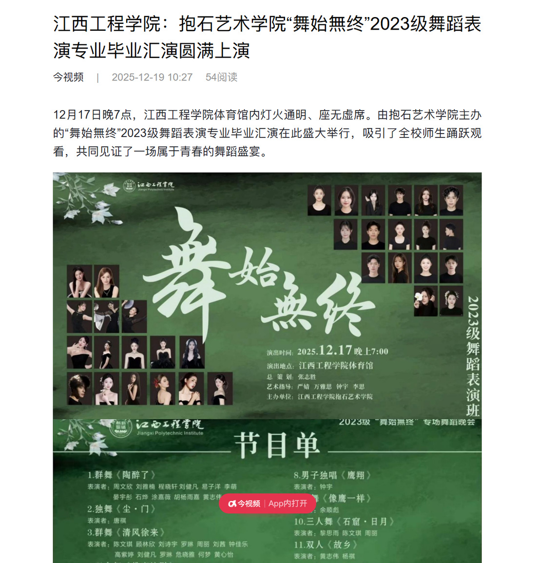 “舞始無终”,不仅是一场毕业汇演,更是学子们舞蹈生涯的一个重要节点。他们以身体为笔,以舞台为纸,绘制出属于青春的动人画卷。未来,他们将继续怀揣对舞蹈的热爱,走向更广阔的艺术天地,舞出不息的精彩。(刘永东 供稿)