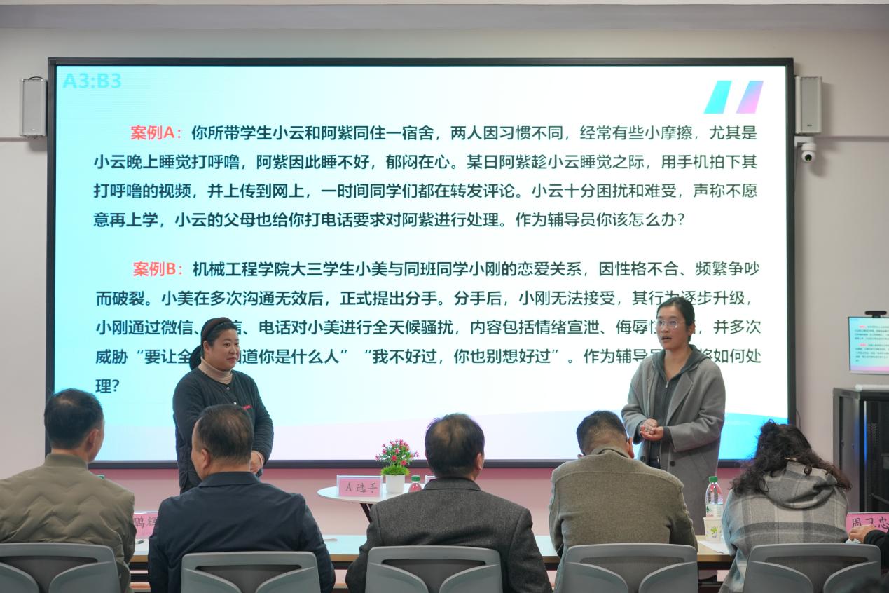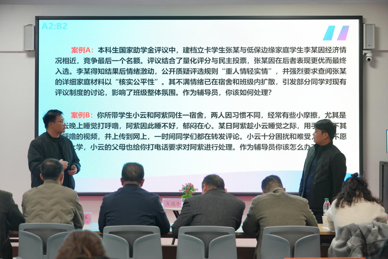 案例研讨环节以“我提问,你回答”的创新形式开展,参赛选手通过赛前抽签确定分组与案例,围绕学生管理中的典型问题共同辨析原因、研讨对策。选手们思路清晰、言之有据,充分展现了分析问题、研判问题、解决问题的专业能力,评委现场提问环节更凸显了临场应变与深度思考能力。