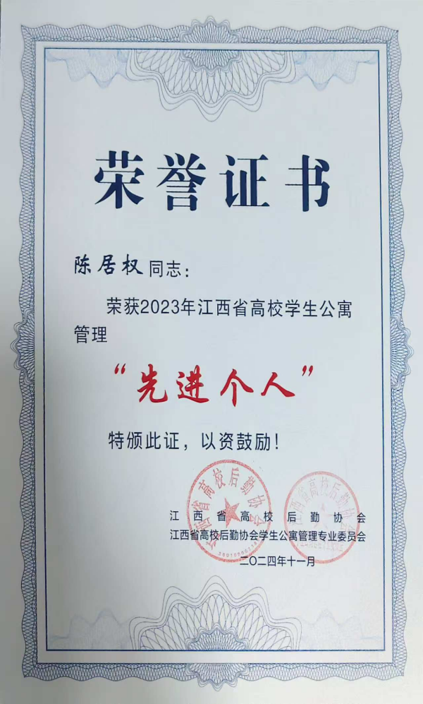 2025年,学校“一站式”学生社区建设工作持续深耕、硕果盈枝。2025年12月,江西省高校学生公寓管理专业委员会2025年年会暨学生公寓管理规范化建设推进会在赣州召开,学校连续获评2023、2024年度江西省高校学生公寓管理“先进单位”称号,陈居权、朱鹏飞等同志获评“先进个人”。省级荣誉的连续获得,不仅是对学校“一站式”学生社区管理服务工作的高度认可,更印证了学校“一站式”学生社区育人工作的深厚成效。