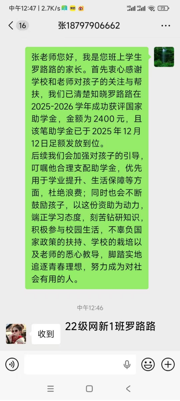 类似这样一条条满载着肯定与温情的短信,飞向了天南地北的学生家长手机中。对于部分未及时回复短信或情况特殊的家庭,各学院辅导员、班主任通过电话进行一对一沟通,详细告知学生获奖受助情况、资助政策意义以及款项发放事宜,并悉心听取家长的意见与心声。