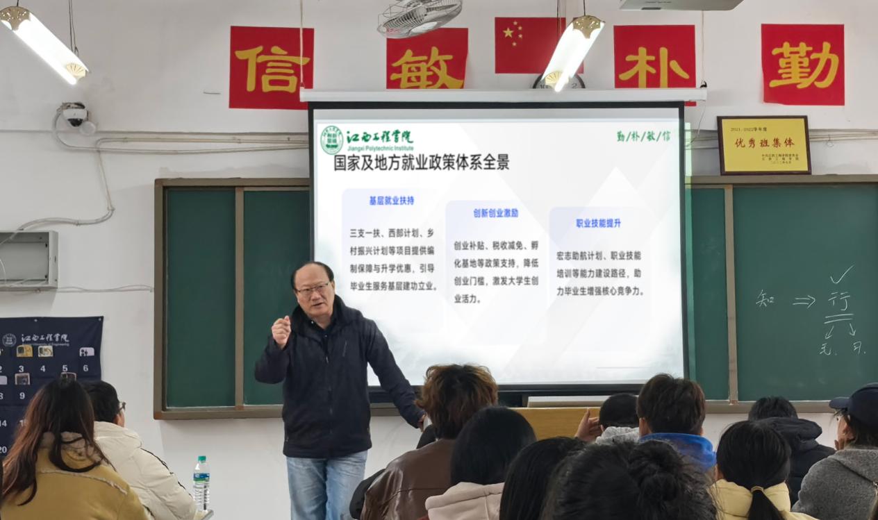 刘新跃首先阐述了当前就业工作的时代背景与战略意义。他强调,党中央、国务院始终将高校毕业生就业摆在突出位置,推出一系列有力政策,为同学们成长成才、就业创业营造了良好环境。他结合宏观经济形势、行业发展动态与个人治学从教经历,围绕专业定位、职业前景、就业现状等维度进行了深入浅出的讲解,引导同学们树立正确的择业观、事业观,科学规划大学生涯,着力夯实专业基础,培育核心竞争能力,不断提升自身在就业市场中的适应力与竞争力。
