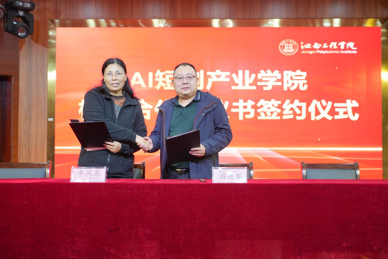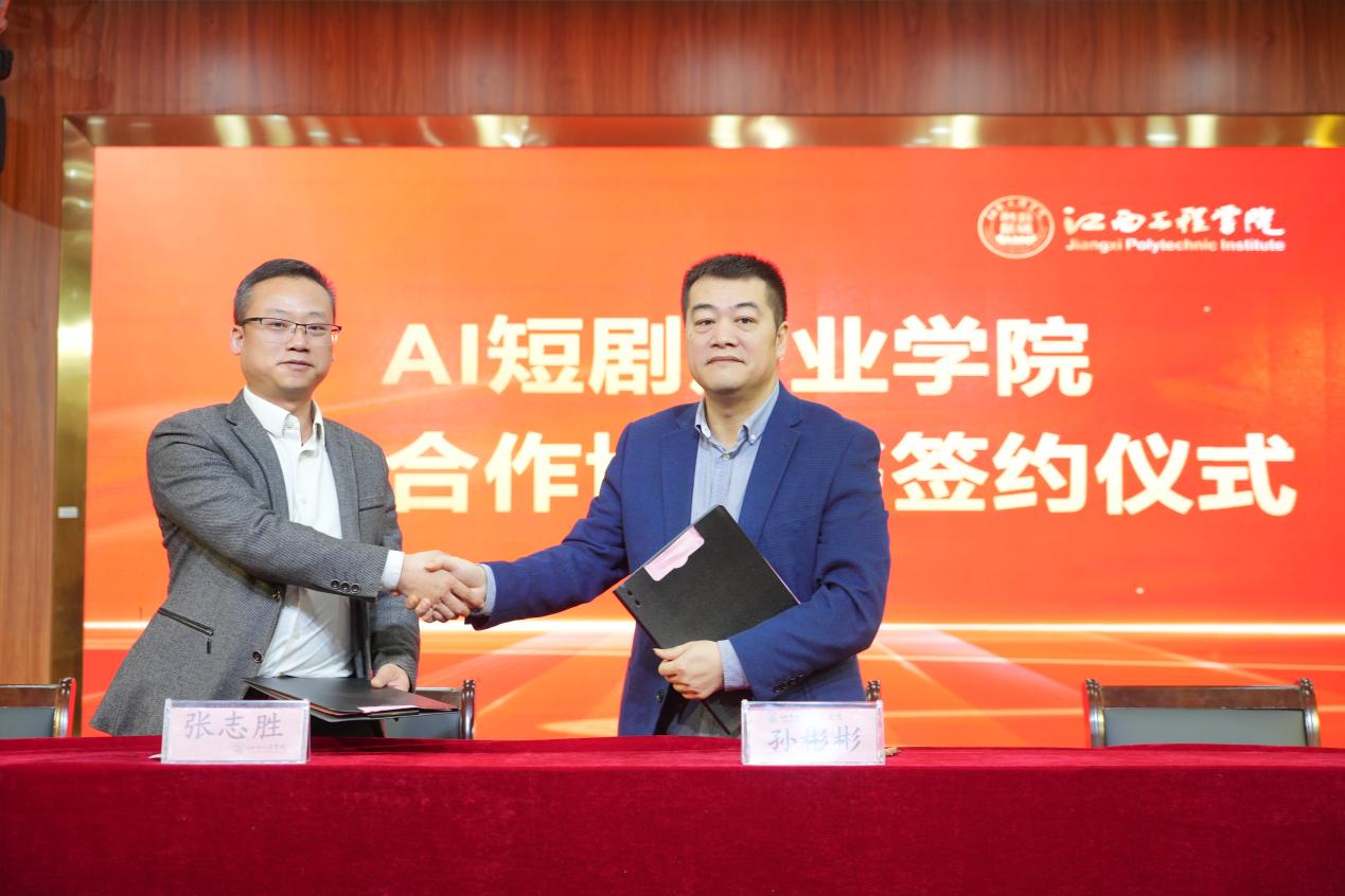 在与会嘉宾的共同见证下,抱石艺术学院院长张志胜、语言与传播学院(国际教育学院)院长车婧分别与各企业代表签署校企合作框架协议。随后,校领导、企业代表与相关部门负责人共同为“beat365体育官方网站AI短剧产业学院”揭牌,标志着产业学院正式成立运行。